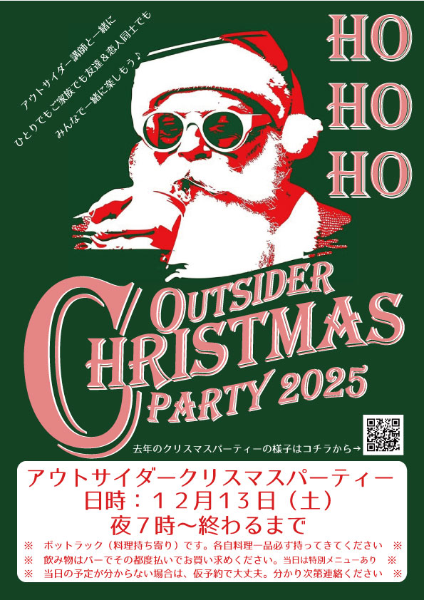 いよいよクリスマスの季節がやってきました。毎年恒例のアウトサイダーのクリスマス・パーティーを盛大に行いたいと思います。普段話す機会が少ない先生達やスタッフと一緒にクリスマスを祝いましょう!